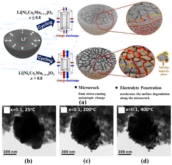 - Yan, P.; Zheng, J.; Gu, M.; Xiao, J.; Zhang, J.G.; Wang, C.M. Intragranular Cracking as a Critical Barrier for High-Voltage Usage of Layer-Structured Cathode for Lithium-Ion Batteries. Nat. Commun. 2017, 8, 1–9. [Google Scholar] [CrossRef]
