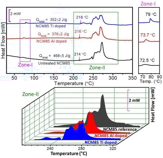 - Levartovsky, Y.; Wu, X.; Erk, C.; Maiti, S.; Grinblat, J.; Talianker, M.; Aurbach, D. Enhancement of Structural, Electrochemical, and Thermal Properties of Ni-Rich LiNi0.85Co0.1Mn0.05O2 Cathode Materials for Li-Ion Batteries by Al and Ti Doping. Batter. Supercaps 2021, 4, 221–231. [Google Scholar] [CrossRef]
