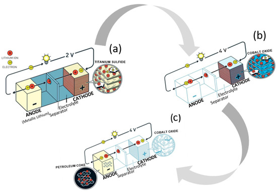 Research on lithium-ion batteries (LIBs) began during the oil crisis in the 1970s, when scientists pondered options for alternative energy sources and the potential of rechargeable devices. Stanley Whittingham, a chemist at Exxon mobile, devised a novel battery design with titanium disulfide as the cathode and lithium metal as the anode, which could be charged in a short period of time (Figure 1a). It was not successful, however, due to the thermal runaway evident in early tests. An engineering professor and physicist, John B. Goodenough from the University of Texas in Austin, advanced it by swapping out the titanium disulfide cathode for lithium cobalt oxide (LCO), thereby doubling the energy capacity of the battery (Figure 1b) [11]. Five years later, Akira Yoshino from Meijo University in Nagoya, Japan, applied a carbonaceous material instead of the lithium metal anode, which proved ground-breaking, as it was the first prototype of a lithium-ion battery without lithium metal (Figure 1c). For developing this “rechargeable technology”, the three aforementioned scientists shared the Nobel Prize in 2019.