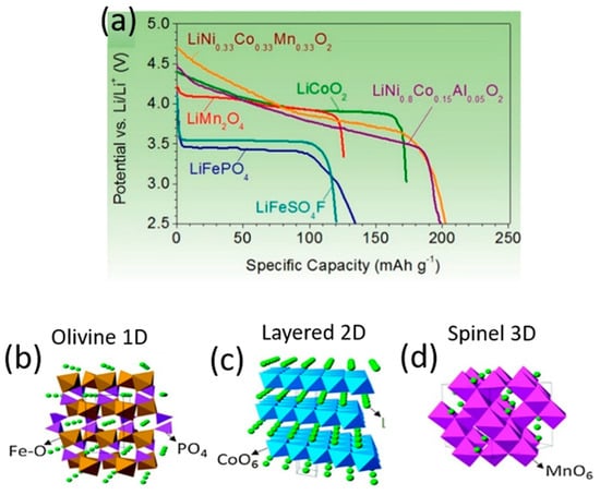 Among the components in a Li-ion cell, it is the cathodes that restrict energy density and dictate the cost per kilowatt–hour. Modern cathode materials are transition metal oxides, and three classifications of them exist according to their crystal structure: (a) layered LiMO2 (M: Ti, V, Cr, Co, Ni), with a two-dimensional layered crystal structure of LiCoO2; (b) spinel oxides (e.g., LiMn2O4, LiTi2O4, LiNiO2) of three-dimensional morphology; and (c) the one-dimensional morphology of polyanion oxides such as Li2(MoO4)3, Li2Fe2(WO4), and LiFePO4. In such intercalation cathode materials, Li+ is the guest ion that facilitates ion diffusion. Layered and spinel oxides have a close-packed structure with high density, hence they possess sufficient electronic conductivity (10−1–10−4 S cm−1). Although polyanion oxides exhibit low density and poor electronic conductivity, polyanion class cathodes afford high thermal stability and greater safety than layered and spinel oxide cathodes. Figure 2 details the crystal structure of the cathode materials and their voltage profiles [53,54].