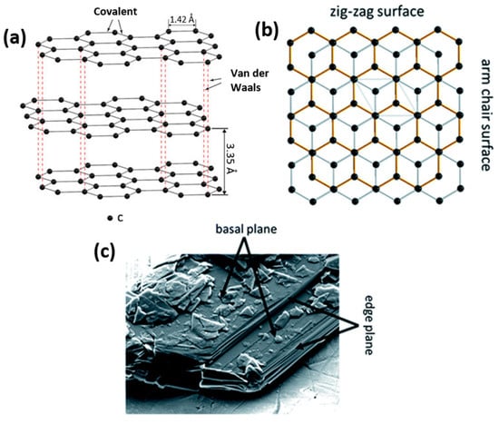 Schematic illustration of the layered graphite structure and the resulting presence of basal and edge planes (a) showing the difference between zig-zag and arm chair surfaces (b) and SEM micrograph of the basal and edge planes for a graphite particle (c).