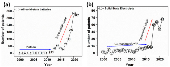 Patent applications on all-solid-state batteries (a) and solid-state electrolytes (b) published in the past two decades.