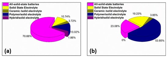 Another interesting aspect concerns the progression of patents published at the end of both examined periods (Figure 6), suggesting that from a total of 26 patents in 2010 (Figure 6a) more than 23% include the key word “all solid-state battery” in the title or abstract, over 53% contain “polymer/solid electrolyte”, in excess of 19% “solid-state electrolyte”, and the remainder of 3.85% ceramic/solid electrolyte “hybrid/solid electrolyte” in 2010 (Figure 6a). The number of patents published rose significantly in 2020 compared to 2010 to 484, out of which 70% related to “all-solid-state batteries”, whereas the rest (13.02%, 10.74%, 3.72%, 1.86%) were about SPE, SSE, SIE, and SHE respectively (Figure 6b).