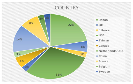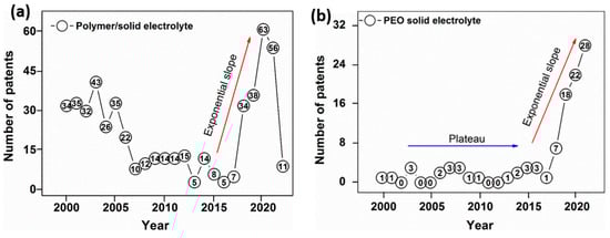 An overview of progression in patents over the past two decades, i.e., between the years 2000 and 2020, is displayed in Figure 5, in relation to patents containing the keywords “all-solid-state battery” and “solid-state electrolyte” in the title or abstract. Graphical representation, as shown in the first half of analyzed period (2000–2010), reveals an exceedingly small number of patents related to ASSBs (Figure 5a), with a plateau-like trend and slight incline at the end of the first period (2010). Greater interest was evident for solid-state electrolyte patent applications (Figure 5b), which saw in increase in the second analyzed period (2010–2020), when the number of published patents rose exponentially, peaking at ca 342 patents for ASSBs in 2020 and 67 for SSE in 2019.
