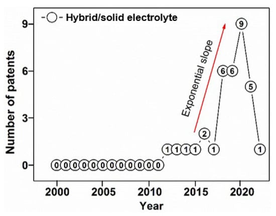 There are many aspects related to ASSBs that might be patented, such as materials and electrodes, cells, modules and packaging, reliability, and means of manufacture. Data relating to the patent disclosures investigated below were collected from the European Patent Office. The search process was based on the following keywords: “all-solid-state battery”, “solid-state electrolyte”, ceramic/solid electrolyte” (LIPON, Li3N, perovskite, garnet, sulfide, LISICON, NASICON-type), “polymer/solid electrolyte” (polysiloxane based, single lithium-ion conductive polymer), “hybrid/solid electrolyte” (ceramic in polymer and vice versa).
