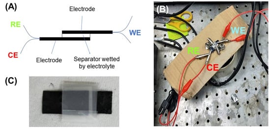 (A) A scheme and (B) an image of two-electrode configuration. (C) An image of a two-electrode cell.