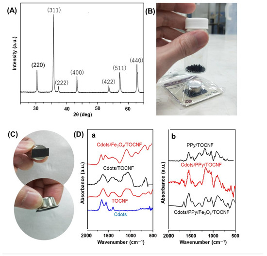 The TOCNF-films embedded Fe3O4 NWs and PPy were black owing to the black color of both additives. The magnetic properties of the Fe3O4 NWs and the Fe3O4/TOCNF film were confirmed by their attraction to the magnet, as shown in Figure 2B,C. Figure 2D(a) shows IR absorption spectra of Cdot and various TOCNF films. The characteristic IR bands of TOCNF were the OH bending-vibration mode at 1620 cm−1, the CH bending-vibration mode at 1380 cm−1, the C-O-H out-of-plane bending-vibration mode at 1120 cm−1 and the C-O-C stretching vibration mode at 1050 cm−1 [28]. The bands of the COO− antisymmetric and symmetric stretching vibration modes were located at 1610 and 1420 cm−1, respectively, and overlapped on the OH and CH bending-vibration bands, respectively, confirming the presence of the carboxylate group on the TOCNF. The three main bands of the Cdots at 1650, 1550 and 1400 cm−1, respectively, were ascribed to C=O/C=N stretching-, N-H bending/C=C stretching- and C-N stretching-vibration modes [6]. These characteristic IR bands of the TOCNF and Cdots were observed in the IR spectra of the Cdots/TOCNF and the Cdots/Fe3O4/TOCNF. An additional characteristic band of the Cdots/Fe3O4/TOCNF at 553 cm−1 was attributed to an Fe-O stretching mode of the Fe3O4 NWs [29].