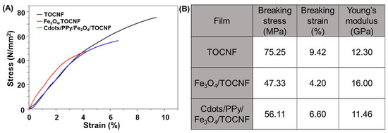 The mechanical properties of the composite films were evaluated (see Figure 3A). According to the stress–strain curve, the TOCNF film possessed a higher breaking strain (9.42%) and breaking stress (75.25 N/mm2) than the Fe3O4/TOCNF and Cdots/PPy/Fe3O4/TOCNF films. The addition of the Fe3O4 decreased the breaking stress to 47.33 N/mm2 and the breaking strain to 4.20%. When the Cdots/PPy layer was deposited on the Fe3O4/TOCNF film, the breaking stress and the breaking strain increased to 56.11 N/mm2 and 6.60%, respectively. That is, the addition of PPy and Cdots on an Fe3O4/TOCNF film slightly recovers the mechanical performance of the composite film.