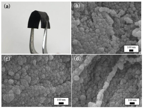 No material peeled off from the surface of the composite film after the electrochemical measurement and the surface remained smooth upon visual inspection. As evidenced by the comparison between Figure 4b,d, even after the electrochemical measurement, the particle size was almost the same as before the electrochemical measurement. These results indicate that the composite film was stable and that the electrochemical testing might not have damaged it.