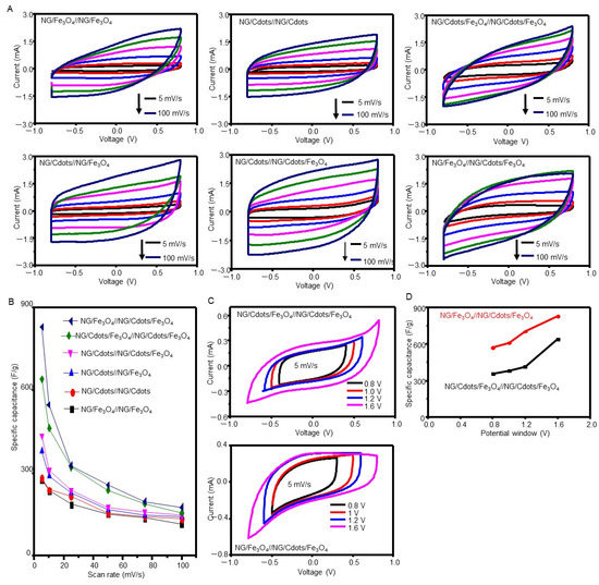 Based on the NG/Fe3O4, NG/Cdots and NG/Cdots/Fe3O4 hybrid electrodes, two electrode configurations made from both symmetric ((NG/Fe3O4)//(NG/Fe3O4), (NG/Cdots)//(NG/Cdots) and (NG/Cdots/Fe3O4)//(NG/Cdots/Fe3O4)) and asymmetric ((NG/Cdots)//(NG/Fe3O4), (NG/Cdots)//(NG/Cdots/Fe3O4) and (NG/Fe3O4)//(NG/Cdots/Fe3O4) devices were fabricated and electrochemical measurements were performed. Figure 5A shows the CV curves of different electrode devices at sweeping rates from 5 to 100 mV/s. All the CV profiles showed relatively quasi-rectangular shapes, with close to ideal EDLC behavior and without observable redox peaks because of the rich NG contents in all the electrodes. The specific voltametric capacitances from the CV results were computed and plotted in Figure 5B. The specific capacitances decreased with the increasing scan rate. The results of the measurement of the specific capacitance indicate that higher capacitance was achieved in asymmetric the devices than in the symmetric devices and, in addition, that the symmetric (NG/Cdots/Fe3O4)//(NG/Cdots/Fe3O4) and asymmetric (NG/Fe3O4)//(NG/Cdots/Fe3O4) devices were the best symmetric and asymmetric devices, respectively. Furthermore, when the CV profiles of these devices were recorded over the potential window from 0.8 to 1.6 V at a sweep rate of 5 mV/s, the CV profiles took on similar shapes, as shown in Figure 5C, indicating that an electrode is stable at different potential windows, the specific capacitance increases with the potential window and the specific capacitance of asymmetric devices is superior to that of symmetric devices (see Figure 5D).