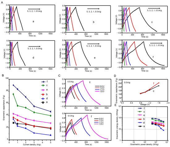 The GCD profiles collected at different current densities (from 0.5 to 5 A/g) are displayed in Figure 6A. The GCD revealed a near-symmetric triangle and no severe voltage drop was recorded in any of the symmetric- and asymmetric-electrode devices, indicating the low internal resistance, fast ion diffusion and excellent reversibility of charge/discharge processes [3]. As shown in Figure 6B, the gravimetric specific capacitance decreased with the increasing current density. Moreover, the asymmetric devices always showed greater specific capacitance at 0.5 A/g than the symmetric devices, while the capacitances of the symmetric (NG/Cdots/Fe3O4)//(NG/Cdots/Fe3O4) and asymmetric (NG/Fe3O4)//(NG/Cdots/Fe3O4) devices were the highest among the symmetric and asymmetric devices, respectively. The extended study on the GCD profile at 0.5 A/g over various potentials (0.8 to 1.6 V) of these two devices is shown in Figure 6C, where it is shown that all the curves measured over the potential window maintained their symmetric shapes. The discharging time increased with the potential window; hence, the gravimetric specific capacitance increased. The obtained gravimetric capacitance increased from 104 and 108 F/g at 0.8 V to 212.0 and 252.2 F/g at 1.6 V for the symmetric and asymmetric supercapacitors, respectively (see Figure 6D), indicating that the potential window can affect the gravimetric capacitance. The behaviors of the GCD were consistent with those of the CV.