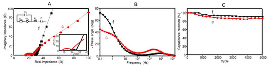 (A) Nyquist plots, (B) Bode phase plots and (C) capacitance retention of (c) symmetric (NG/Cdots/Fe3O4)//(NG/Cdots/Fe3O4)) and (f) asymmetric ((NG/Fe3O4)//(NG/Cdots/Fe3O4)) devices.