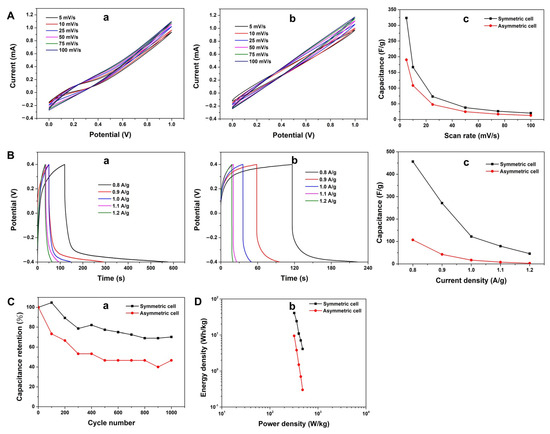 The gravimetric energy density and power density were assessed, as they are important indicators of electrochemical storage devices. They are displayed as Ragone diagrams (Figure 8D). The specific energy density increased with the increasing specific capacitance, but the specific power density decreased following the increase in the specific energy density. Thus, the highest energy density of 40.6 Wh/kg, of the symmetric cell, which was higher than that of the asymmetric cell, was obtained at specific power density of 320 W/kg.