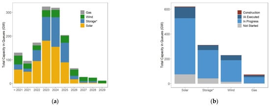 Interconnection queues for capacity generation from different energy sources. (a) Expected yearly distribution for capacity to become online. * Also includes co-located/hybrid storage capacity for some projects. (b) Total capacity in different stages of queues as of 2021 where IA = interconnection agreement [30].