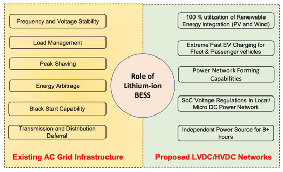 Role of lithium-ion-based battery energy storage systems in existing AC grid infrastructure vs. proposed DC power networks.