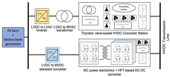 It is vital to implement a HVDC transmission network to connect distant PV and wind generation sites with urban and suburban load centers such as XFC stations. To incorporate new DC power generation for newer loads, the legacy transmission grid requires several upgrades, as explained in Section 2. The existing high voltage AC (HVAC) transmission upgrades are costly, time consuming, and create a severe imbalance for the AC grid power flows. Without changing the existing transmission topology, a macro-HVDC network should be developed to connect remote PV and wind farms with newer load centers. HVDC technology has several advantages over HVAC, such as narrower right of way (ROW), fewer dielectric and capacitive losses, increased power-carrying capacity, transmitting higher voltages without increasing current carrying capacity—thereby reducing sag and heating issues [38]—and many more. All these benefits can be leveraged by often using the same wires and structures, by just switching to HVDC power. However, traditional HVDC practices are based on line-commutated conversion (LCC), which involve multiple AC-to-DC and DC-to-AC conversion stages. Such conversion losses can be eliminated with voltage source converter (VSC) techniques and by employing several high-efficiency DC-to-DC converters. Many LVDC-to-MVDC and MVDC-to-LVDC converters are readily available in the market today. However, design of an efficient solid-state converter for MVDC-to-HVDC and HVDC-to-MVDC applications is the need of the hour. Our proposed conceptual design for a MVDC-HVDC-MVDC converter is highlighted in Figure 5 and discussed in detail in [10]. The proposed XFC charging architecture will utilize silicon carbide (SiC)-based converters with high-frequency transformers for converting LVDC power from PV and battery storage farms to HVDC transmission.