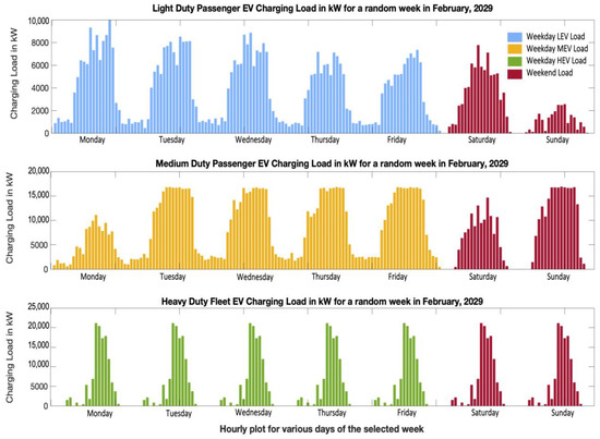 - The combined load profiles for all three types of charging stations (in Table 2) are depicted in Figure 7. For passenger LD loads, separate weekend and weekly profiles were generated, and a random week was chosen for graphing purposes. Since seasonal variations do not account for much variability in HD truck fleets, as assumed in [63], we excluded those variables in our load model.