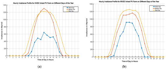 PV farms’ irradiation profiles for different days of sunshine. (a) For the ID#2 HVDC-connected Rexford 1 and 2 farm; (b) for the ID #1 MVDC-connected Mount Signal 1, 2, 3 farm.