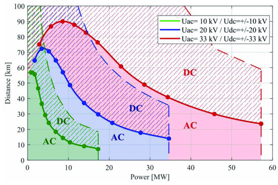 - Métayer, P.L.; Paez, J.; Touré, S.; Buttay, C.; Dujic, D.; Lamard, E.; Dworakowski, P. Break-even distance for MVDC electricity networks according to power loss criteria. In Proceedings of the 23rd European Conference on Power Electronics and Applications (EPE’21 ECCE Europe), Ghent, Belgium, 6–10 September 2021; pp. 1–9. [Google Scholar] [CrossRef]