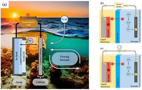 A SWB cell (Figure 1a) is the combination of an open-structured cathode with Na metal as the anode (with a potential of −2.73 V vs. standard hydrogen electrode (SHE)) creating a high voltage electrochemical cell. Separating these two components is NASICON (NA Super Ion CONductor, Na3Zr2Si2PO12), a sodium ion conducting membrane that only allows the passage of Na+, acting as a solid separator that prevents other ions from reaching the anode. Due to the high reactivity of the Na metal, the anode part is sealed, ensuring that only the separator is exposed to seawater. Inside the anode, the Na metal is attached to a current collector and immersed in a non-aqueous liquid electrolyte, used as a buffer layer between the Na metal and the solid separator to ensure good ionic conductivity and a stable Na deposition [1].