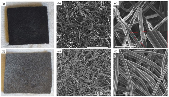 Photographs of the used carbon felts: (a) commercial (CCF) and (d) activated (ACF) and their SEM images: CCF surface at (b) 1 mm and (c) 100 μm scales, where the white regions are the NaCl deposited, and ACF surface at (e) 1 mm and (f) 100 μm scales.