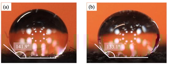Scheme of the contact angles of the drops used to measure the wettability on top of the (a) CCF and (b) ACF.