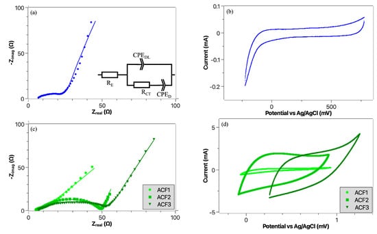 Electrochemical impedance spectroscopy (EIS) fitted spectrum and cyclic voltammetry of CCF ((a,b), respectively) and of ACF with one (ACF1), two (ACF2) and three (ACF3) layers ((c,d), respectively), in a three electrode configuration [Pt/(Ag/AgCl)/CCC] in a seawater solution.