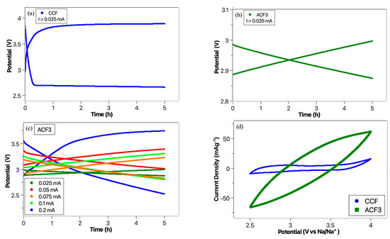 CCF cyclic voltammetry analysis is presented in Figure 5d. It is possible to see that, although redox reactions may be present, they are not the dominant factor within the electrochemical stability window [30]. The current density refers to the amount of active material in the anode (36 mg of Na metal). On the other hand, the CV for ACF3 (Figure 5d) is substantially different from the CCF one. In the ACF3 case, it is harder to identify the onset potentials associated with the faradaic reactions, with a dominant capacitive effect originated by the increase in the specific surface area. Nonetheless, the pseudo-oval shape of this CV curve indicates that there is in fact an extra resistive component. The extra resistance has two possible origins, the three layers of ACF used to reach a thickness similar to that of CCF and ACF3 poorer wettability. Although this extra resistive component changes the CV shape to a pseudo-oval, a significant capacitive contribution is responsible for the obtained low voltage gap and activation polarization effect [31]. We calculated the relative variation of the gravimetric capacitance due to the difficulty in isolating the cathode capacitance contribution in the full cell configuration. A 260% capacitance increase was observed. Both gravimetric capacitances were calculated by excess (CCF; 6.7 F g−1 and ACF; 24.3 F g−1, for 36 mg of sodium metal as the active material at the anode).
