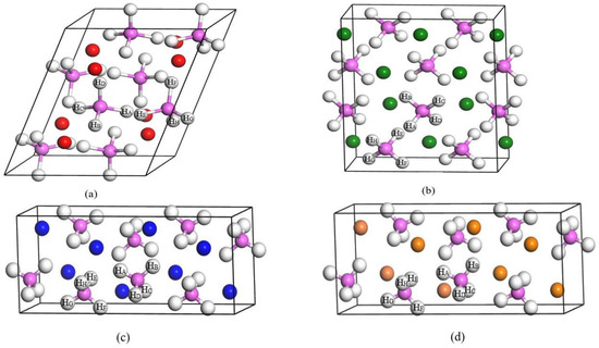 The alkali metal aluminum hydrides of MAlH4 (M = Li, Na, K, and Cs) considered in our studies have space groups of P21/C (monoclinic structure, LiAlH4) [27], I41/A (tetragonal structure, NaAlH4) [28], and Pnma (orthorhombic structure, KAlH4 and CsAlH4) [29,30], as shown in Table 1. The geometric optimization of these aluminum hydrides gave the relaxed lattice parameters and volume (Table 1), whose level of agreement with the experimental data [27,28,29,30] is fairly high. Using relaxed MAlH4, a 2 × 1 × 1 supercell consisting of 8 MAlH4 units (M8Al8H32) was established for calculations, as illustrated in Figure 1. In this figure, two [AlH4] units in MAlH4 bulk are considered for hydrogen desorption, with their H atoms labeled as HA, HB, HC, HD, HE, HF, and HG, and Al-H and H-H distances within 1.625–1.643 Ǻ (Al-H) and 2.639–2.754 Ǻ (H-H) in each [AlH4] unit. From these Al-H and H-H distances, the H bonding (Al-H and H-H bonding) in the [AlH4] group can be predicted [31]. The previous experimental and theoretical studies on aluminum hydrides also provide support for the formation of Al-H and H-H bonds in the [AlH4] unit [31,32,33].