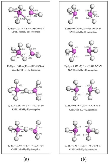 The formed AlH3 group, hydrogen dissociation energy (Ed-H2), and total energy (E) for MAlH4 (M = Li, Na, K, and Cs) with HA and HX desorption: (a) HA and HX from one [AlH4] unit; (b) HA and HX from two [AlH4] units. The bond lengths between Al and H atoms in AlH3 group are described (in Ǻ).