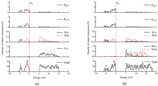 As described above, Al-H and H-H bonds can be detected in the [AlH4] groups of MAlH4 (M = Li, Na, K, and Cs). Thus, upon dehydrogenation, the release of HA or/and HX from the considered [AlH4] units (Figure 1) may be accompanied by the separation/rupture of Al-H and H-H bonds. In addition, weakened Al-H bonds are believed to be beneficial to the dehydrogenation of aluminum hydrides [55,56,57]. In consideration of these facts, determined the bonding features between Al-H and H-H according to the density of states, charge density distributions, and Mulliken populations should be help clarify the dehydriding mechanism of the alkali alanates of MAlH4 (M = Li, Na, K, and Cs).
