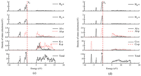 The total (TDOS) and partial density of states (PDOS) for MAlH4 (M = Li, Na, K, and Cs), with Fermi level (EF, marked with vertical dotted line) at 0 eV and H atoms (HA and HB) from considered [AlH4] unit in Figure 1: (a) LiAlH4, (b) NaAlH4, (c) KAlH4, and (d) CsAlH4. The TDOS labeled by I and II are mainly contributed by Al and H electronic states.