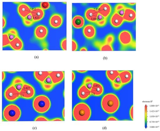 The electronic density contours for MAlH4 (M = Li, Na, K, and Cs) with the contour line from 0.03 to 0.18 electrons/Ǻ3: (a) LiAlH4, (b) NaAlH4, (c) KAlH4, and (d) CsAlH4. Li, Na, K, Cs, Al, and H atoms are denoted by red, green, blue, orange, pink, and white spheres, respectively. The shortest distances between Al and H atoms and H and H atoms in this figure are described (in Ǻ).