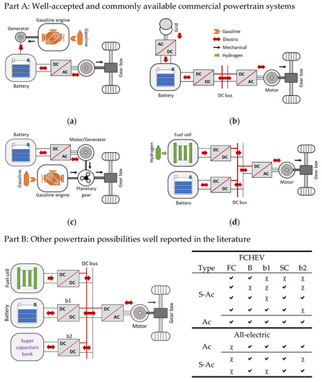 Nevertheless, various well-proportioned combinations of electrochemical sources from Figure 3 (Part A) have already provided well-accepted and commonly available commercial products: gasoline hybrid electric vehicles (GHEV), range-extender hybrid electric vehicles (r-HEV), battery electric vehicles (BEV), and fuel cell hybrid electric vehicle (FCHEV) [15,16,17,18]. These products are identified by distinct merits in terms of commercial penetration, acceptance, and maturity, though the latter two (BEV and FCHEV) are the only true successors regarding complete electrification. It is worth mentioning here that the topologies presented in Figure 3 (Part A) do not correspond to an exhaustive list, but rather several possibilities can be viable both economically and performance-wise, as evident in the literature and elaborated comprehensively in Figure 3 (Part B).