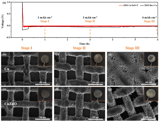 (a) The voltage distribution profiles of Li||Cu and Li||Cu/ZnO cells upon galvanostatic Li deposition. SEM images of (b–d) 3DM Bare Cu and (e–g) 3DM Cu/ZnO current collectors along 1 (stage Ⅰ), 3 (stage Ⅱ), and 6 mAh cm−2 (stage Ⅲ) of lithium deposition. The insets show the photographs of 3DM Bare Cu and 3DM Cu/ZnO current collectors after 1, 3, and 6 mAh cm−2 of lithium deposition.