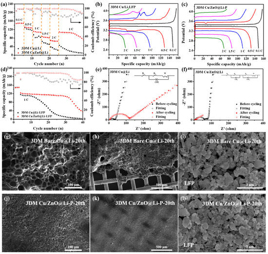 (a) Rate capability of the full cell with 3DM Cu@Li and 3DM Cu/ZnO@Li-P composite anode at different rates ranging from 0.1 to 2 C. (b,c) Voltage profiles during the rate testing at different current density. (d) Cycling performance of full cells with 3DM Cu@Li and Cu/ZnO@Li-P composite anode at 1 C with three activation cycles at 0.1 C in the beginning. EIS curves of two current collectors on lithium-free anodes: (e) before cycling, (f) after 20 cycles at 1 C. SEM images of (g,h) 3DM Cu@Li composite anode and (j,k) 3DM Cu/ZnO@Li-P composite anode after 20 cycles lithium stripping. The SEM images of cathodes: (i) 3DM Cu@Li composite anode and (l) 3DM Cu/ZnO@Li-P composite anode full cells.