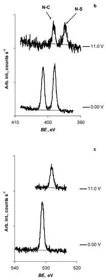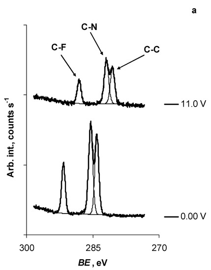 The analysis of the CV data, measured in the potential range of 0.0 V to 11.0 V and at various potential scan rates, indicated that the electro-oxidation process forming a current peak at E = 7.80 V (v = 1.0 mV s−1, i = 0.91 mA cm−2) was diffusion-speed limited, whereas the relationship between the oxidation Ip vs. v1/2 was linear with a slope of 2.6 × 10−3 A s1/2 V−1/2 (0.25 mV s−1 ≤ v ≤ 50 mV s−1, R2 = 1.00) (Figure 3b, inset). Thus, due to the very large intensity, irreversibility, and the shape of the CV curves near E = 7.8 V, we believe that this diffusion-speed-limited process is connected with the electro-oxidation of the TFSI− anion itself. The electrochemical oxidation of the TFSI− anion can also explain the large variations in the BE vs. E slope values for the 1 s in situ X-ray spectra of the elements studied (Table 1). However, although no changes are distinguishable in the shapes of the in situ X-ray spectra (measured in the potential range of E = 0.0 V to E = 11.0 V (Figure 1)), except for the reduction of the PE-signal intensity, the formed TFSI− electro-oxidation products remained very likely at the N4111(TFSI)|Al/Al2O3 interface (i.e., under thick N4111(TFSI) layer) or evaporated into the vacuum.