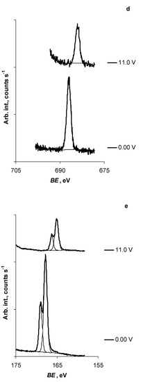 The shapes of the C 1s, N 1s, O 1s, F 1s, and S 2p XPS spectra collected at a positively polarised Al current collector covered with N4111(TFSI) were stable within the potential (E) range from 0.00 V to 11.0 V (Figure 1a–e). It is important to note that no Al 2p signal was observed at the RTIL|vacuum interface within the potential range explored. This confirms that if the Al3+-containing substances formed at the Al | N4111(TFSI) interface during Al oxidation they did not dissolve in N4111(TFSI). Additionally, the N4111(TFSI) layer at the Al/Al2O3 electrode was thick enough and therefore no photoelectrons were detected from a clean Al surface or from its compounds (i.e., Al2O3, AlF3, and Al(TFSI)3) formed and located at the N4111(TFSI)|Al interface (i.e., forming the Al electro-oxidation resisting layer, i.e., solid-electrolyte interface—SEI).