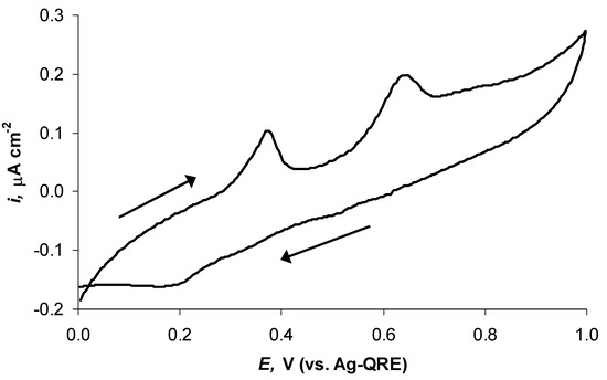 The cyclic voltammogram (CV) measured within the potential range of 0.00 V to 1.00 V and reverse at the potential sweep rate of 1.00 mV s−1. The second CV sweep is presented; the potential sweep directions are indicated in the figures with arrows.