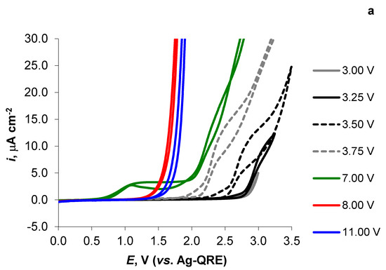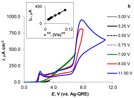 When performing the CV measurements within the potential range of 0.00 V to 8.00 V and 0.00 V to 11.0 V and reverse, a voltammetric peak formed in the forward and reverse scans at E = 2.1 V (Figure 2c,d and Figure 3b). The anodic-current peak (Ip) values for the forward scan, measured at E = 2.1 V, were in a linear correlation with the v applied (10 mV s−1 < v < 50 mV s−1, R2 = 1.00). The shape of the measured CV curves near E = 2 V and the oxidation-current peak behaviour (e.g., the irreversibility of the electro-oxidation process) indicate the specific adsorption/desorption process of TFSI− anions (as well as of N4111(TFSI), Table 1, Figure S1a–i) taking place at ca. E = 2.1 V at the previously activated Al electrode (Figure 3b and Figure S2c,d). We believe that the electrochemical decomposition of N4111(TFSI) was unlikely near E = 2 V, as that process should have a diffusion speed-limited character, and we did not see visually or from the shape of the I vs. E relationships the formation of gas bubbles.
