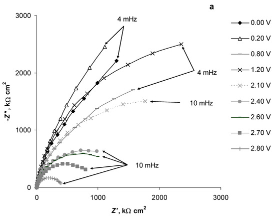 Nyquist plots, i.e., the relationships of the imaginary vs. real parts (−Z″ vs. Z′) of the electrochemical impedance measured in the potentiostatic regime, are presented in Figure 4a–c. The −Z″ vs. Z′ dependences are characteristic for mixed kinetic processes (adsorption and mass-transfer step limited) and showed high −Z″ values at very low frequencies within the potential range of 0.00 V to 0.50 V (Figure 4a), indicating the absence of faradic processes and marking that the Al surface covered with Al2O3 [11,17,22,25,26] behaved like an ideal capacitor. The Nyquist plot measured at E = 0.70 V had much lower Z′ and −Z″ values at lower comparable frequencies and were moderately bent, indicating a finite length-diffusion process at Al/Al2O3 (i.e., some pitting corrosion) process at that potential (Figure 4a), notable also in the CVs (Figure 2). At E ≥ 0.80 V, the size of −Z″ vs. Z′ curves increased somewhat towards larger Z′ and –Z″ values, indicating the filling of the pits and pores, leading to the decreasing of the pitting-corrosion speed at the Al electrode.