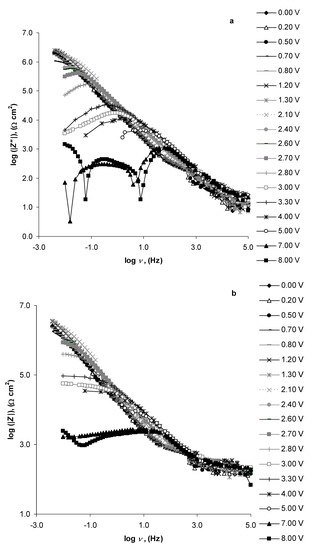 Figure 5a shows that the log |Z″| vs. log-frequency (ν) plots were linear with a slope of −0.84 in the log ν range from −1.60 (Hz) to 3.80 (Hz) and in the potential range of 0.00 V to 2.10 V, indicating that the N4111(TFSI)|Al/Al2O3 system behaved almost like an ideally polarisable system. At E ≥ 2.40 V, a maximum started to form at low frequencies. By increasing the Al/Al2O3 electrode potential, this log |Z″| maximum moved towards higher frequencies and obtained a peak-like shape. This change in the log |Z″| vs. log ν plot shapes indicated the activation of the Al/Al2O3 electrode and the start of faradic processes. The log |Z″| vs. log ν plots, measured at E = 7.00 V and E = 8.00 V, had two characteristic minimums at ν = 3.9 Hz and ν = 16 mHz, and at ν = 7.9 Hz and ν = 63.2 mHz (corresponding to |Z″| = 0 in the Nyquist plots), respectively (Figure 5a).