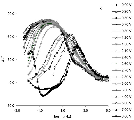 The phase angle (δ) vs. log ν plots (Figure 5c) show that the N4111(TFSI)|Al/Al2O3 system was nearly ideally polarisable at E = 1.20 V and E = 1.30 V, when the phase angles were the most negative δ = −82° (ν = 0.40 Hz), as noted in the Nyquist plots at the same potentials (Figure 4a). At more positive Al potentials, the phase-angle values started slowly to increase. That process intensified at E > 2.60 V, marking the start of faradic processes. It is remarkable that the second phase-angle peak formed in the –δ vs. log v plot at E = 8.00 V and log v = −1.80 (Hz) (Figure 5c). This phase-angle peak indicates the presence of the second adsorption-step limited electrochemical process, having a much smaller time constant and running parallel to the Al electro-oxidation process.