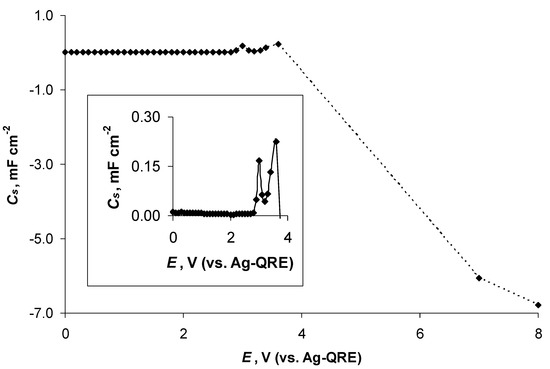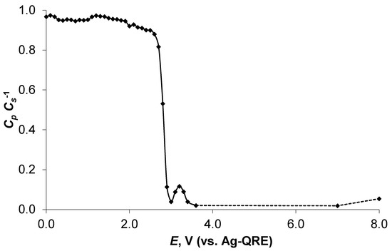 The dependence of the ratio Cp · Cs−1 on E, being an indicator of the ideal polarisability of an investigated electrochemical system [44], had the closest values to the unity from E = 0.00 V to E = 2.60 V (from Cp · Cs−1 = 0.97 to 0.88, respectively) (Figure 8). The N4111(TFSI)|Al system was nearly ideally polarisable up to E = 2.60 V (Cp · Cs−1 = 0.88), marking the end of the high-stability region for the N4111(TFSI)|Al interface. At more positive potentials, a steep decrease in the Cp · Cs−1 values took place, obtaining a minimum at E = 3.00 V (Cp · Cs−1 = 0.04) corresponding to a high-intensity charge-transfer process due to the start of intensive electrochemical oxidation of the Al electrode (Figure 3a and Figure 8).