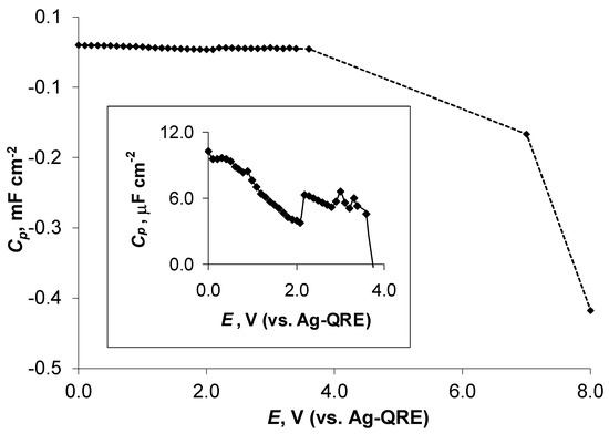 The parallel-capacitance (Cp) values (describing the capacitance of the electrical double layer at the electrode surface), measured at the modulation frequency ν = 0.10 Hz and calculated from the impedance data [44], showed a similar trend, presented in Figure 6, for Cs. Values of Cp slightly decreased from 0.00 V to 3.60 V, indicating that the properties of the electrical double layer changed very little at N4111(TFSI)|Al/Al2O3 in this potential region (Figure 7). At E > 3.60 V, the N4111(TFSI)|Al system became unstable. However, the Cp values, calculated from the EIS low-frequency data measured at E = 7.00 V and E = 8.00 V, were significantly reduced. The negative values of Cp = −0.12 mF cm−2 at E = 7.00 V and −0.37 mF cm−2 at E = 8.00 V were caused by intensive electrochemical oxidation processes, leading to the formation of the inductive loop in the EIS Nyquist plot at the low-frequency section. Thus, the intensive electro-oxidation and dissolution of the Al electrode, electro-oxidation of the TFSI− anion, and variable relaxation processes, including the instability of the electrical double layer, took place at the N4111(TFSI)|Al interface [13,42].