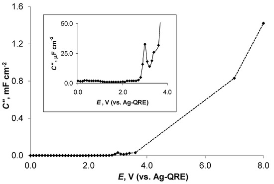 The values of imaginary capacitance C″, measured at the modulation frequency ν = 0.10 Hz, were calculated as in refs. [44,45]. High C″ values indicate the presence of energy dissipation by an irreversible electro-oxidation process that leads to the appearance of hysteresis (e.g., to the formation of the current hysteresis in the CV curves (Figure 3a and Figures S2a–d and S3a–d) or to the formation of the inductive loops in the Nyquist plots at very low ν values (Figure 4c)) [45]. The C″ vs. E graph showed a peak at E = 3.00 V (C″ = 33 μF cm−2), i.e., at the potential of starting the specific adsorption of N4111(TFSI) and electro-oxidation processes at Al (i.e., the formation of Al(TFSI)3) according to the in situ XPS measurements (Table 1), followed by a continuous increase in the values of C″ at E > 3.20 V up to C″ = 1.4 mF cm−2 at E = 8.00 V (Figure 9) when the low-frequency inductive loop appeared in the Nyquist plot (Figure 4c). It must also be mentioned that at 3.00 V < E < 6.50 V, intensive Al electro-oxidation and the formation of N4111(TFSI)-insoluble Al(TFSI)3 was observed. Thus, the C″ data are in very good agreement with the in situ XPS and voltammetric-measurement results.
