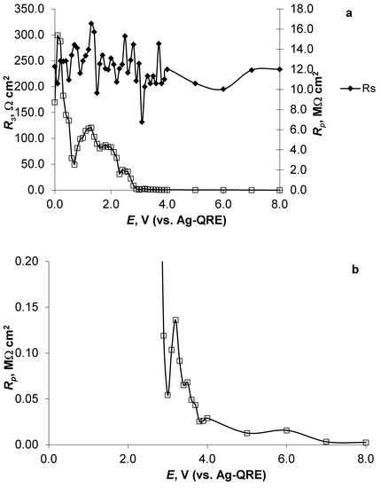 The series-resistivity (Rs) (a) and parallel-resistivity (Rp) (b) relationships vs. Al-electrode potential (E) applied.