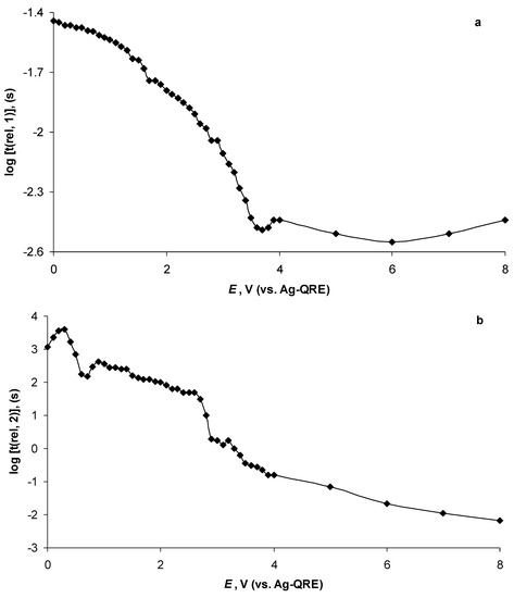 The values of t(rel, 2), estimated graphically from P(w)/S(w) vs. log ν and Q(w)/S(w) vs. log ν plots measured at low potentials applied, were unstable, probably because of difficulties in their precise estimation from the graphs at E ≤ 0.60 V. However, the estimated values of t(rel, 2) seemed to increase from the initial value (t(rel, 2) = 1200 s, E = 0.00 V), as the Al/Al2O3 electrode potential was changed stepwise to be more positive, forming a maximum t(rel, 2) = 4000 s at E = 0.30 V (Figure 11b). Thereafter, a steep reduction in log [t(rel, 2)] values was observed, showing a minimum at E = 0.60 V and E = 0.70 V. At more positive potentials than E > 0.90 V (t(rel, 2 = 420 s), a monotonous reduction in log [t(rel, 2)] values continued until a steeper decrease occurred at E ≥ 2.7 V (Figure 11b). This remarkable change in t(rel, 2) values overlapped with the activation of the Al electrode (steep reduction in the Cp Cs−1 values, Figure 8). At E > 2.90 V (when a Cs peak formed at E = 3.00 V, Figure 6), a slow continuous decrease in the t(rel, 2) values to t(rel, 2) = 0.0067 s was notable until the final potential of E = 8.00 V was applied (Figure 11b). Thus, the values of t(rel, 2) reflect the electrochemical activity of the N4111(TFSI)|Al interface.