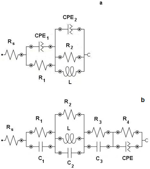 It should be mentioned that the Rs and Rp values at E = 7.00 V and E = 8.00 V, respectively, were calculated from the EIS data based on the simple equivalent circuit shown in Scheme 1. However, it is obvious from the Nyquist and Bode plots that this simple circuit did not describe the real situation, i.e., the formation of the low-frequency inductive loops at E = 7.00 V and E = 8.00 V, respectively. Therefore, the EIS data at E = 7.00 V should be fitted using the equivalent circuit shown in Scheme 2a, which is very similar to the one described in [13,46,47,48]. This equivalent circuit contains (1) a resistor in series (Rs), (2) a first oscillation ring containing a resistor (R1) and a constant phase element (CPE1) connected in parallel, and (3) a second oscillation ring containing a resistor (R2 marking charge-transfer resistance), a constant phase element (CPE2), and an inductor (describing the expansion of the electrochemically active surface area of the Al electrode, i.e., the increase in the surface roughness) connected in parallel. The first (i.e., high-frequency) oscillation ring describes the restricted mass transport through the porous SEI formed at the Al electrode. The second (i.e., mid-frequency) oscillation ring describes the irreversible electro-oxidation of the Al electrode and the expansion of the Al-electrode area (i.e., the roughening of the Al-electrode surface). In the fitting process obtained, the Nyquist plot is shown (see Figure S4). The equivalent circuit elements had the following values: Rs = 0.22 kΩ cm2, R1 = 1.7 kΩ cm2, CPE1 = 950 nF cm−2, R2 = 0.89 kΩ cm2, CPE2 = 26 μF cm−2 (a = 0.85), and L = 1.1 kH. Although the Kramers–Kronig test yielded the result X2 (Z) = 7.0 · 10−12, we consider that the recorded EIS data and the numerical values of the circuit elements calculated in the fitting process are trustworthy.