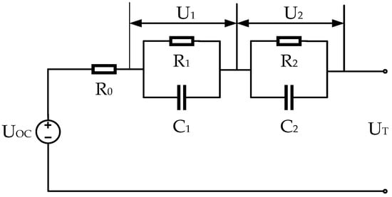 To reduce the complexity of the model and improve its accuracy, this paper adopts the second-order RC equivalent circuit model, as shown in Figure 2.